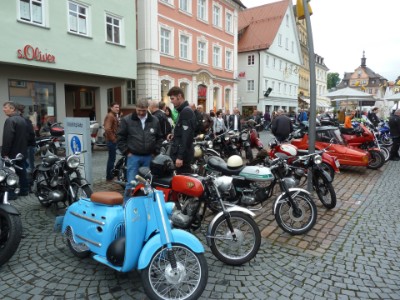 Wenigstens am Start am Gmünder Feuerwehrhaus war es am Samstag gegen 10:30Uhr von oben her noch "trocken". Die Oldtimerfreunde Straßdorf haben sich mit den anderen Teilnehmern am Sebaldplatz zu einem Korso aufgestellt und sind in der Kolone - zusammen mit OB Richard Arnold im Seitenwagen, über die Klösterlestraße, Kornhausstraße und dann auf den historischen Marktplatz gefahren. Hier erfolgte die Begrüßung durch den OB auf der Bühne vor dem Rathaus. Anschließend spielte passend dazu die Western Highway Country Band Musik aus der "guten alten Zeit". Ausfallen musste allerdings das legendäre Nord-Süd Durchqueren des Bassano, dieses Mal gab es leider nur einen kleinen Kurs direkt zwischen der Johanniskirche und dem Cafe mit insgesamt 36 Oldtimern.